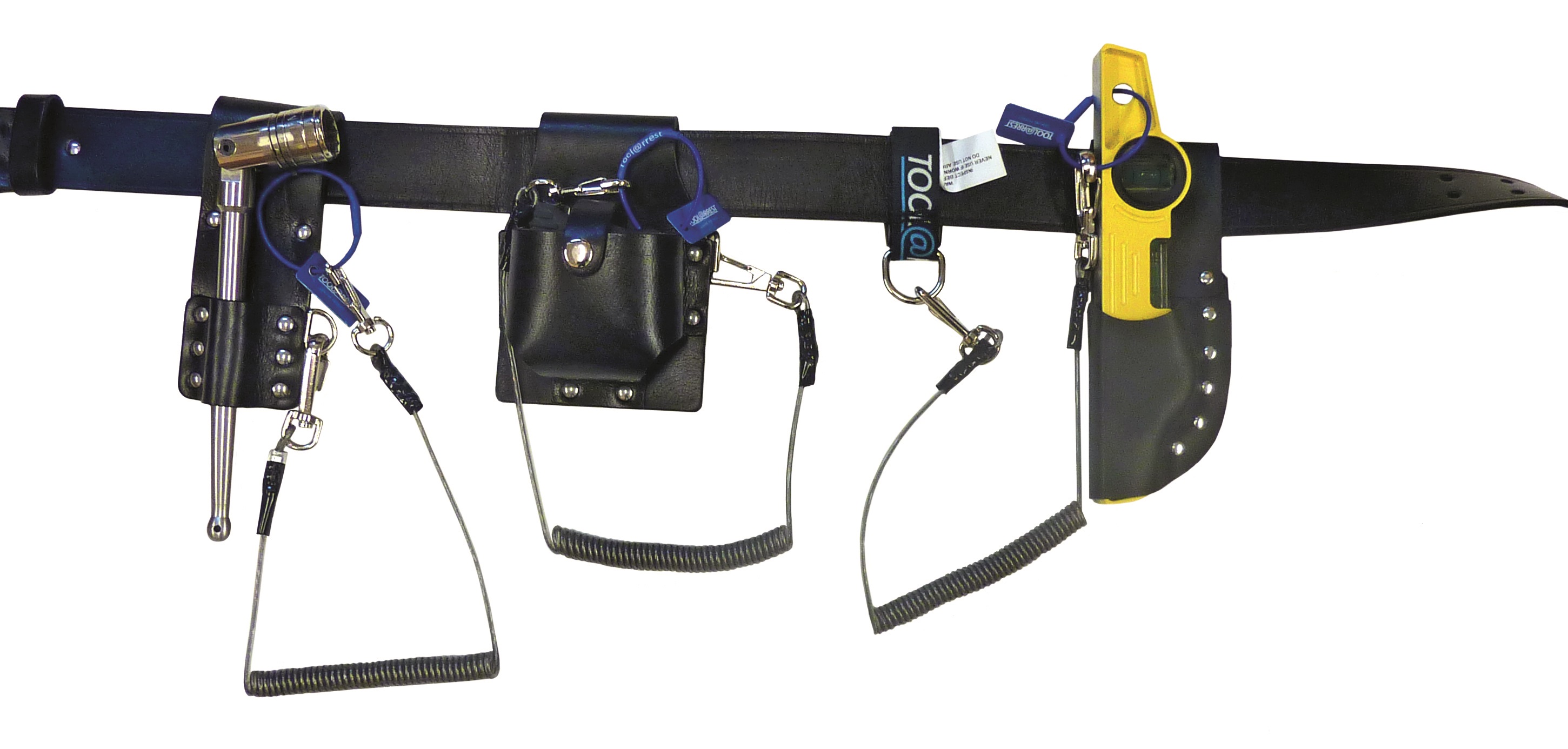 Tool@rrest Global black leather scaffolders belt with 5m tape measure, 7/16 scaffold spanner and 250mm torpedo level with black leather tool holders and coil lanyards.
