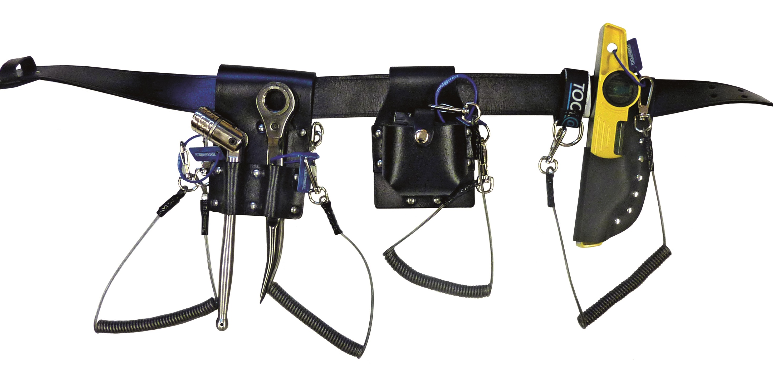 Tool@rrest Global black leather scaffolders belt with 5m tape measure, 7/16 scaffold spanner, 250mm torpedo level and 19 x 21mm podger spanner with black leather tool holders and coil lanyards.