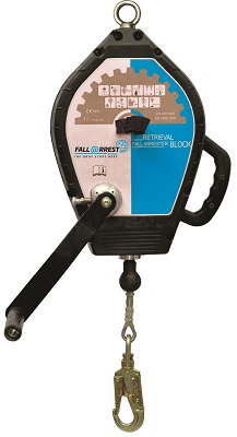 Fall@rrest Global 30m rugged dual action auto retracting 4.5mm galvanised steel wire fall arrest block with in built shock absorption, swivel anchorage eye, double action snap hook with fall indicator, a winch handle to EN360:2002 and EN1496:2006 Class A.