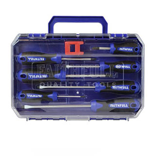 The Faithfull Screwdriver Set contains a selection of screwdrivers with correctly hardened and tempered Chrome Vanadium steel blades. Each scrwedriver is fitted with full size bi-material soft-grip handles for maximum user comfort and firm non-slip grip. Supplied in a handy plastic storage case. Contains: