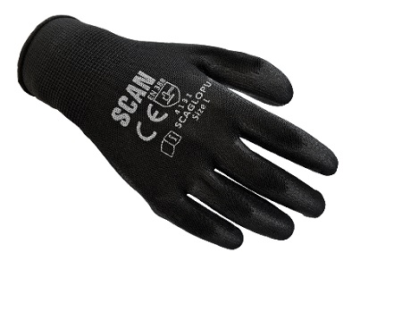 Scan Black PU Coated Gloves are made from knitted nylon with a seamless finish and a fine polyurethane coating over the palm and fingers. The back of the glove is uncoated to provide ventilation to the hand, avoiding perspiration and clamminess. These gloves are suited to work where a high level of dexterity is needed along with a good protection factor.