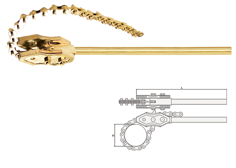 Non sparking chain pipe wrench, max pipe diameter 100m overall length 600mm