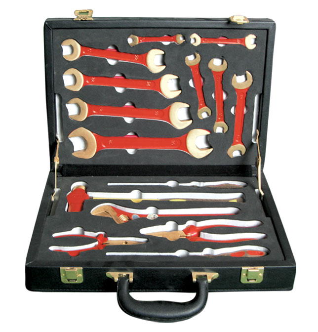 non sparking (Tool set-15pcs) Double Open end Wrench 8*10mm, 10*12mm, 14*17mm, 17*19mm, 19*22mm, 22*24mm, 24*27mm, 30*32mm ,Adjustable Wrench 250mm, Lineman Pliers 200mm, Snipe Nose Pliers 200mm, Slotted Screwdriver 8*200mm, Phillips Screwdriver #3*200mm,
