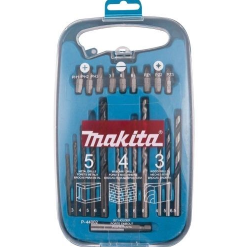 The Makita P-44002 is a 22 Piece Drill and Bit Set. The 12 Piece Drill selection is suitable for Masonry, Metal and Wood applications, all have straight shanks. There is also a 9 Piece Bit selection in Slotted, Phillips and Pozi. Also includes a 60mm 1/4 inch / 6.35mm Magnetic Hex Drive Bit Holder.