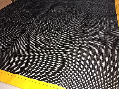 Manufactured in M9919 mesh. With yellow PVC border. With Velcro for folding and Velcro tabs for securing. Mat will come with a carry bag in 610gsm PVC with a shoulder strap and drawcord top.